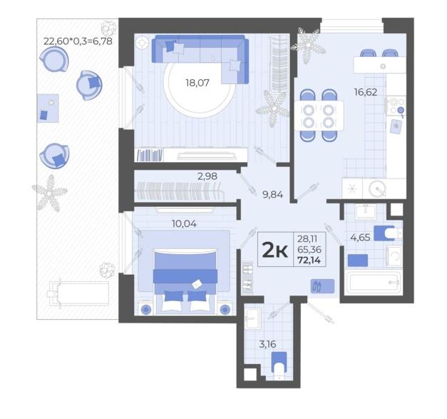 2-комн. планировка 72.14 м² в ЖК «Высочество»